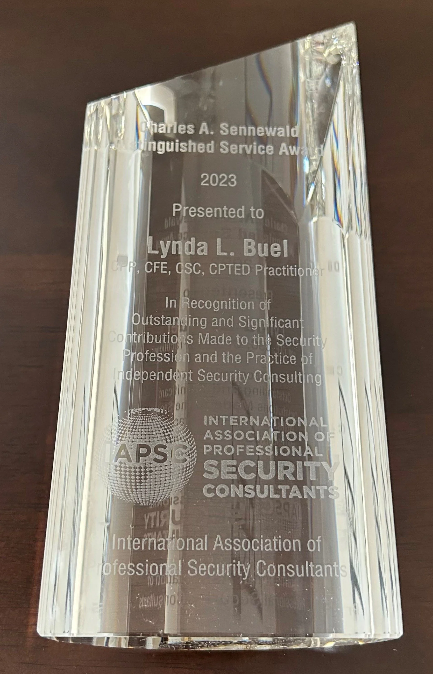 Our President & CEO, Lynda L. Buel, CPP, CFE, CSC, CPTED Practitioner was the recent recipient of the 2023 Charles A. Sennewald Distinguished Service Award through the International Association of Professional Security Consultants (IAPSC). This award is presented to a security executive, educator, author, or industry leader who has made an outstanding and significant contribution to the security profession and the practice of independent security consulting. Lynda joins an esteem group of security professionals becoming the 20th recipient of this prestigious award over the last 30 years.