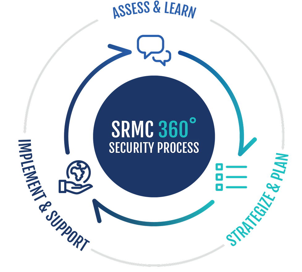 The SRMC 360º Security Process assesses each client's unique security situation (assets, risks, technologies, personnel, culture), creates custom solutions aligned with business needs and best practices, and supports implementation through programs, technology enhancements, and ongoing services to ensure comprehensive protection.